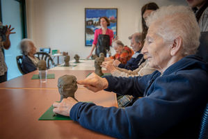 Clay is a wonderful material; it can become anything at all! This time, I decided to begin with the trickiest challenge: the head. I prepared a clay ‘’dummy’’ for each participant: just a rough egg shape on a neck. I then asked them to close their eyes and feel their own ears, then do the same on their sculpture, sculpting the ears. That was the starting point for the participants’ projects. In the final stage, I gave the participants some decorations, which they applied to their creations. All participants were very satisfied with their creations, and proposed that they be exhibited in the lobby of the seniors’ home.